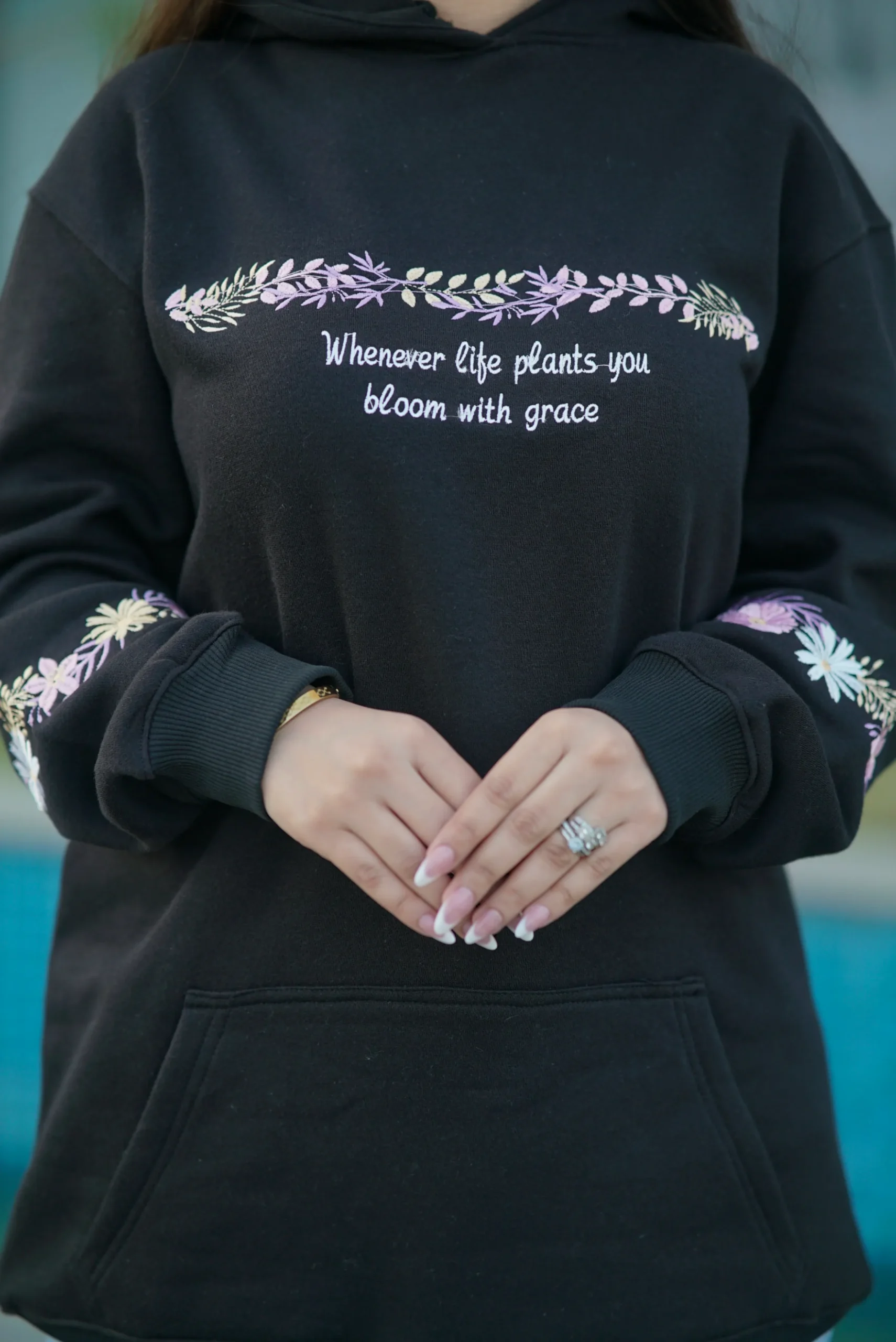 Do not iron directly on prints/embroidery/embellishments